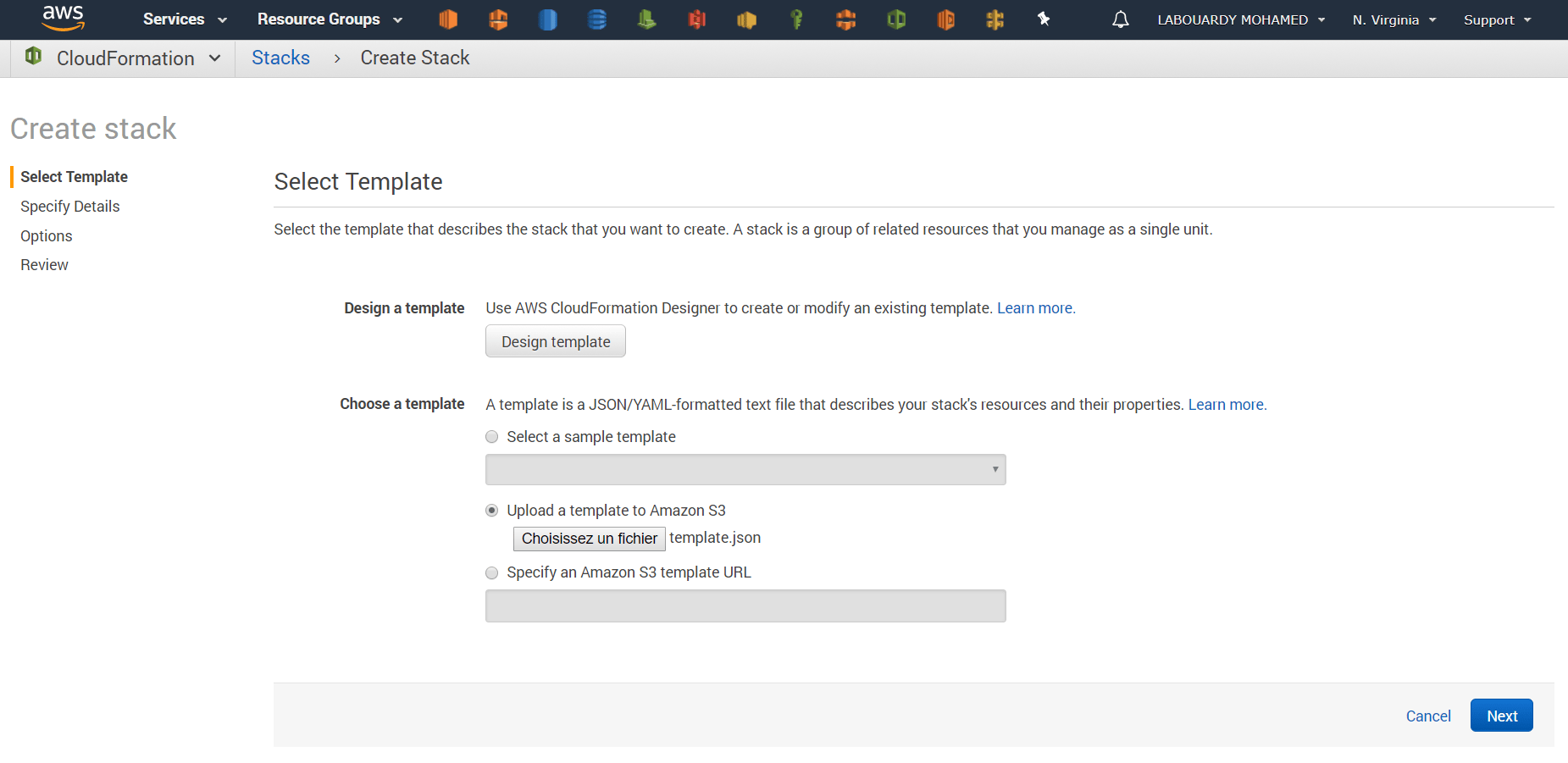 Now we defined the template. Sign in to AWS Management Console then navigate to CloudFormation, and click on “Create Stack“. Upload the JSON file: