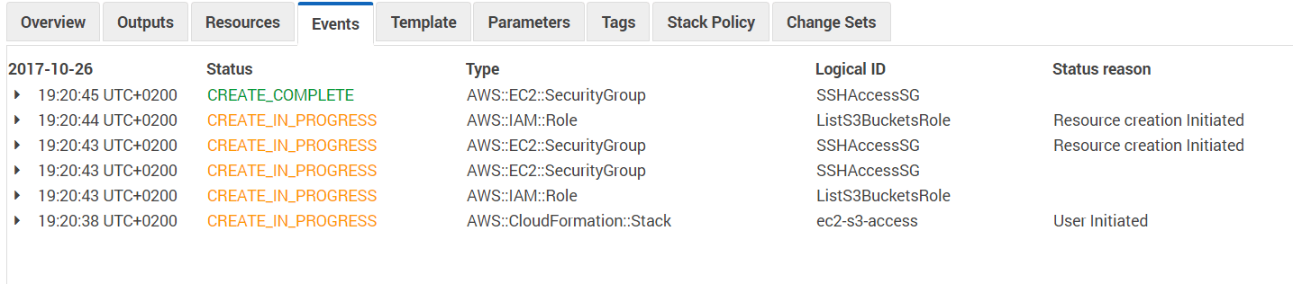After a while, you will get the CREATE_COMPLETE message in the status tab: