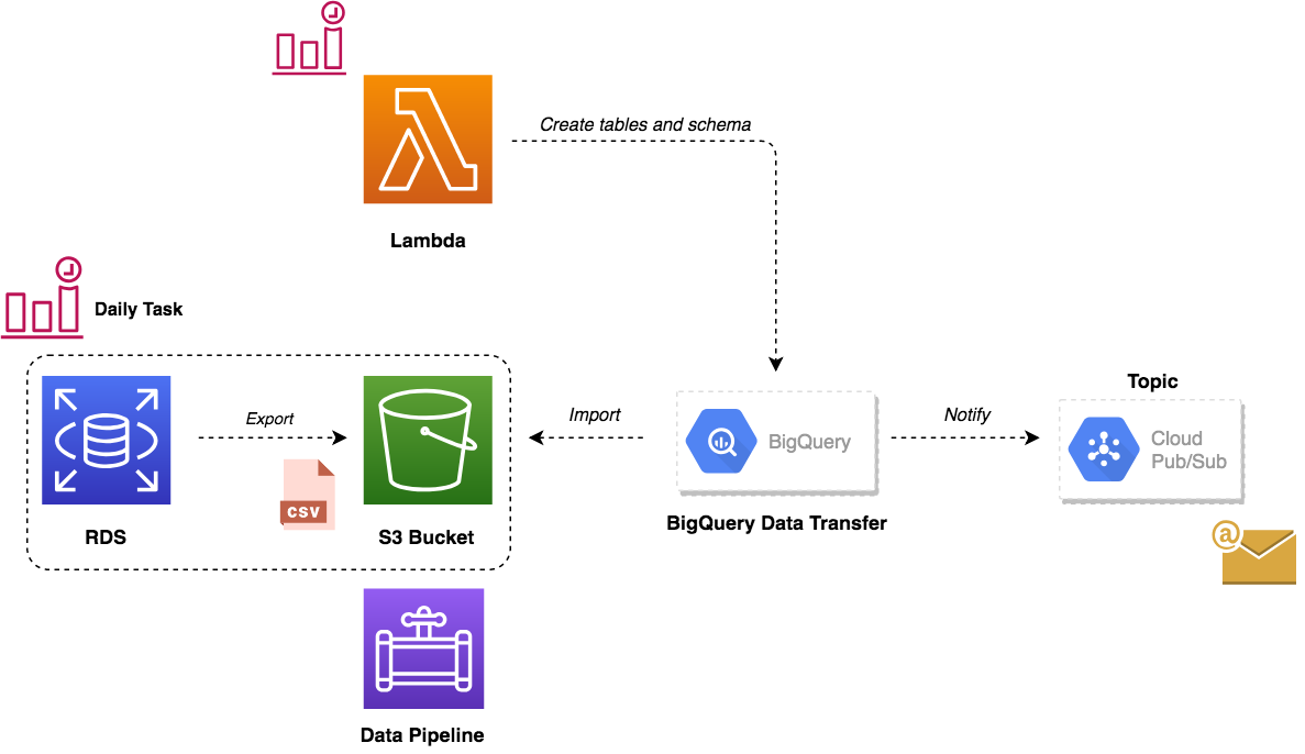 Once we decided which data warehouse we will use, we had to replicate data from RDS MySQL to Google BigQuery. This post walks you through the process of creating a data pipeline to achieve the replication between the two systems.